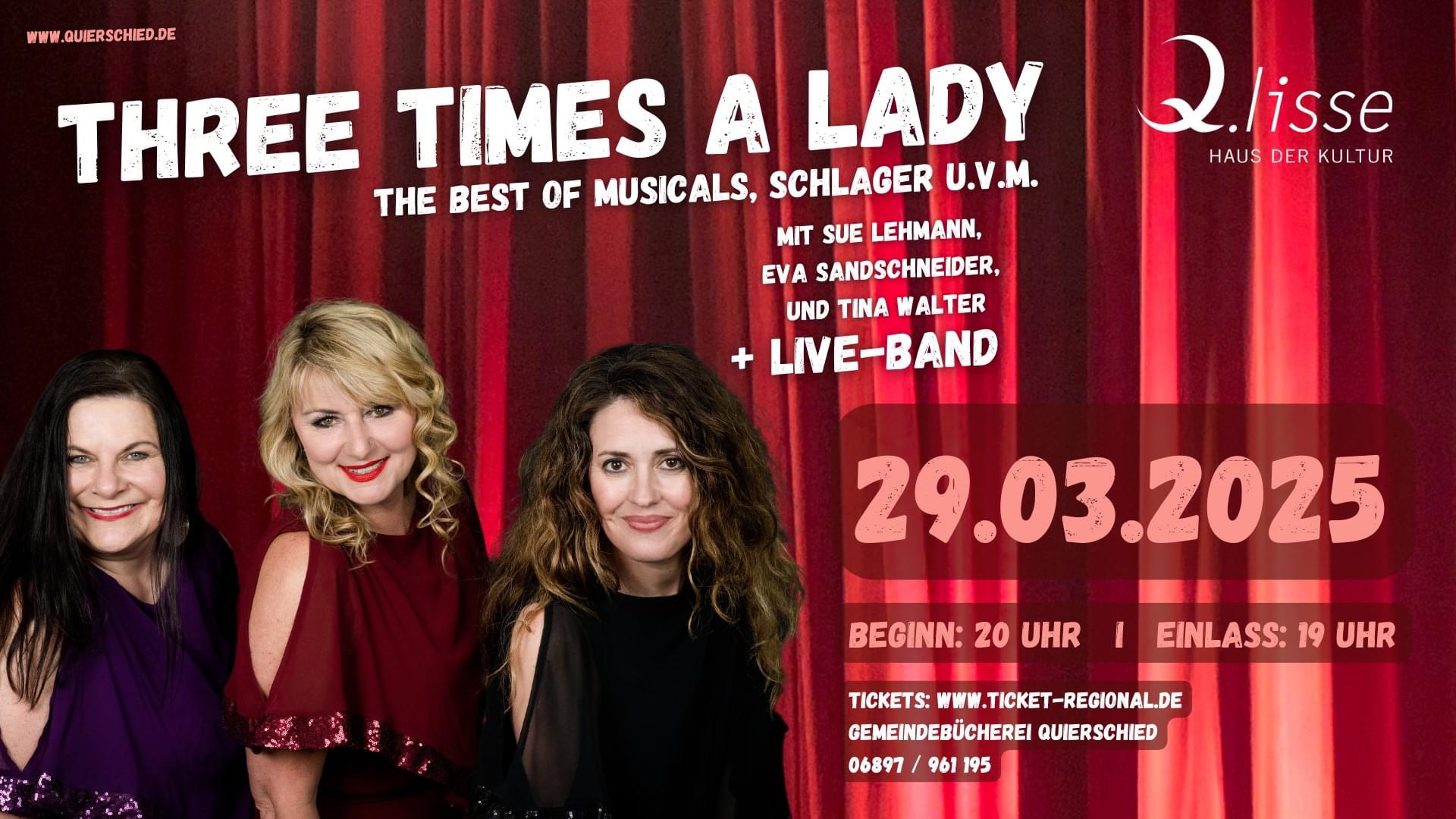 " 3 Times a Lady " Sopranistin Eva Sandschneider, Musicaldarstellerin Sue Lehmann und Soulstimme Tina Walter drei stimmgewaltige Lady Donnerstag 27. Oktober im Rathaus Riegelsberg ,19:30 Uhr Drei Powerfrauen die ihr Handwerk verstehen und das Publikum begeistern.