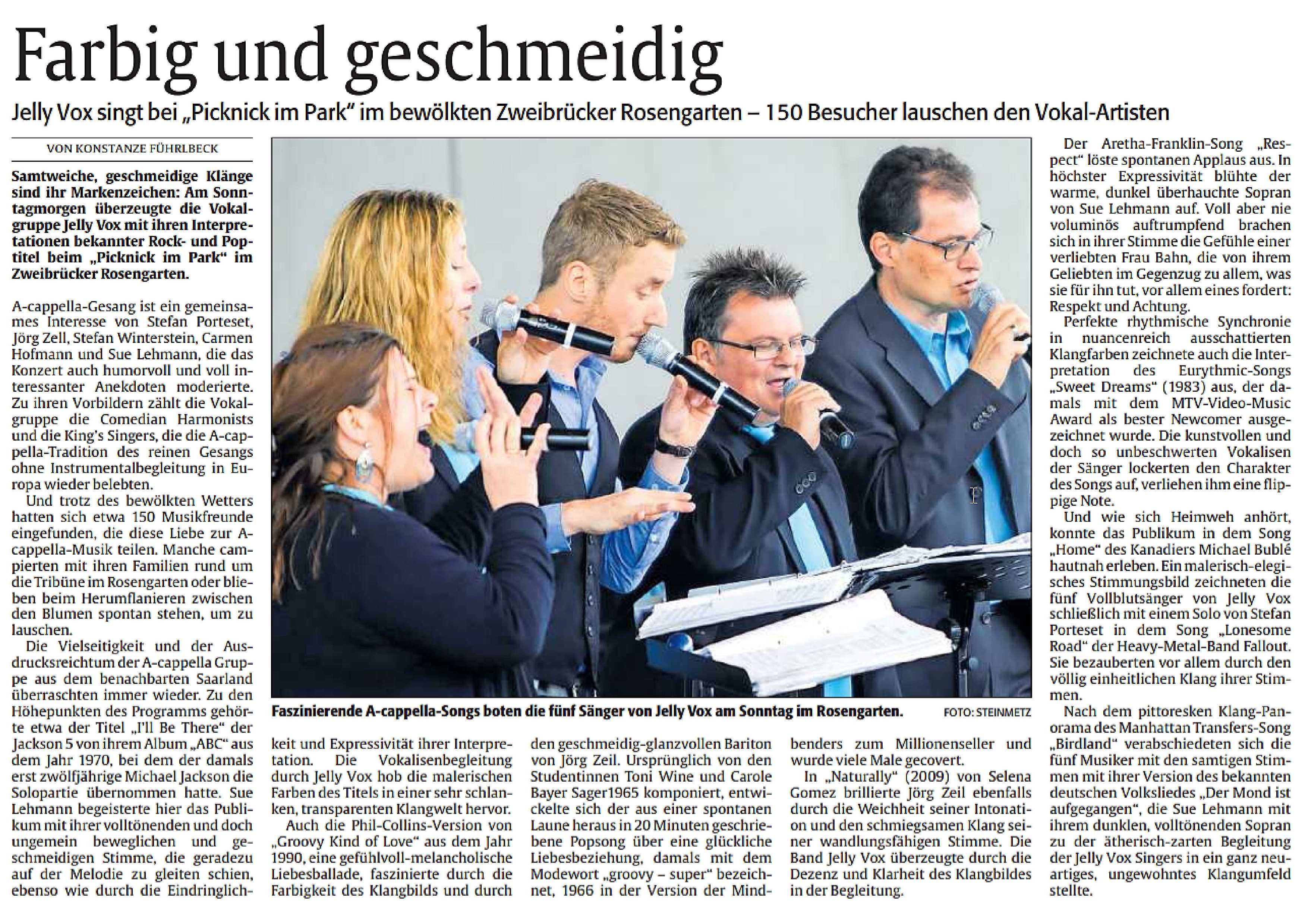 Farbig und Geschmeidig Jelly Vox singt bei „Picknick im Park“ im bewölkten Zweibrücker Rosengarten Von Konstanze Führlbeck Quelle: Die Rheinpfalz Nr 154 vom 05. Juli 2016 |